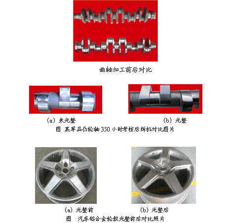 研究成果可使发动机等关键零件毛刺去除、除锈、倒棱倒圆(如凸轮轴两侧锐边形成小于R0.1的圆弧),表面粗糙度Ra值降低1~2级,表面轮廓的支承长度率提高30%以上,清洁度提高50%左右,达到设计和使用要求,表面压应力值增加50%以上,物理力学性能得到较大改善;零件应用光整技术的发动机整机出厂磨合时间减少50%左右,燃油消耗率减少3~4g/kW·h,噪音降低1dB以上,有效功率提高。用未光整零件和光整零件分别装配2万台整机,跟踪一年后统计,曲轴轴颈拉伤、划瓦故障率由0.55%减少为0.069%。