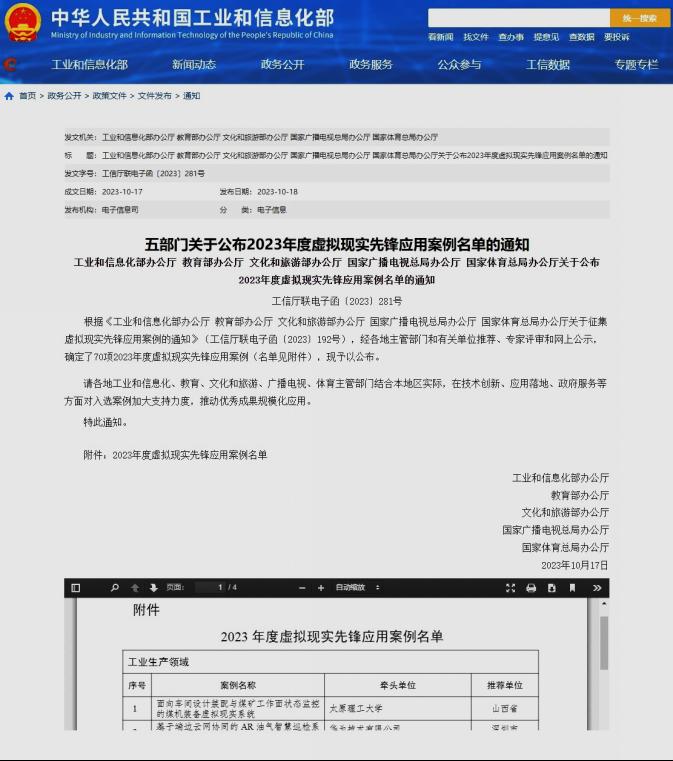 10月17日,工业和信息化部、教育部、文化和旅游部、国家广播电视总局、国家体育总局等五部委办公厅公布2023年度虚拟现实先锋应用案例,新葡官网王学文教授团队完成的“面向车间设计装配与煤矿工作面状态监控的煤机装备虚拟现实系统”经工信部组织评审,成功入选案例名单。