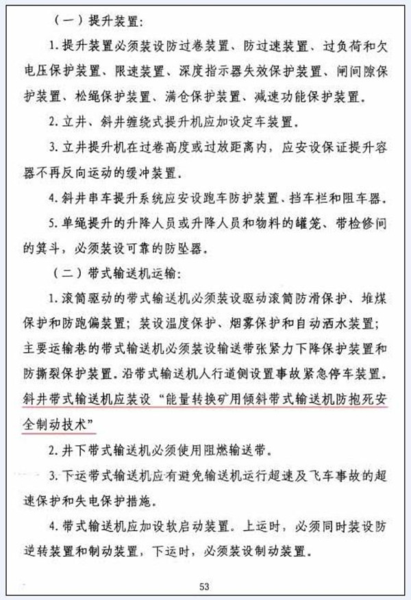 2012年5月22日,山西省煤炭工业厅晋煤办基发【2012】505号文件印发的山西省煤矿建设标准中,第三十八节第二百零六条规定:(二)带式输送机运输:1.滚筒驱动的带式输送机必须装设驱动滚筒防滑保护、堆煤保护和防跑偏装置;装设温度保护、烟雾保护和自动洒水装置;主要运输巷的带式输送机必须装设输送带张紧力下降保护装置和防撕裂保护装置。沿带式输送机人行道侧设置事故紧急停车装置。斜井带式输送机应装设“能量转换矿用倾斜带式输送机防抱死安全制动技术”。
