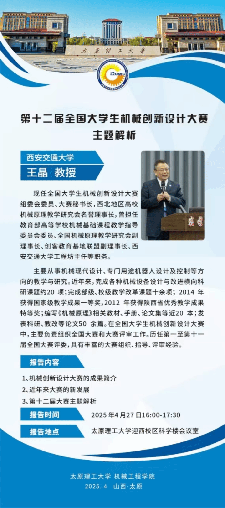 为做好我校全国大学生机械创新设计大赛的组织和指导工作,3003新葡官方网站特邀西安交通大学王晶教授为新葡官网师生做第十二届全国大学生机械创新设计大赛主题解析报告。