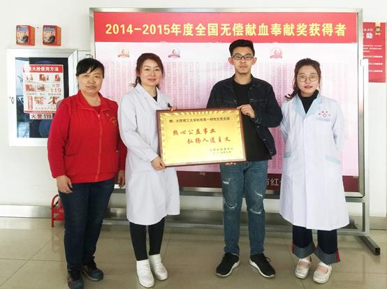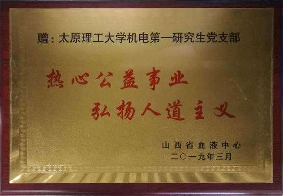 太原市红十字血液中心对党支部组织的这次活动十分支持,向参与献血的同学派发了纪念品,还赠与了牌匾表示感谢,赞扬他们发挥了党员带头作用,对无偿献血事业贡献了自己的力量,希望他们能号召广大的大学生参与到无偿献血、无偿献血小板公益活动中来。