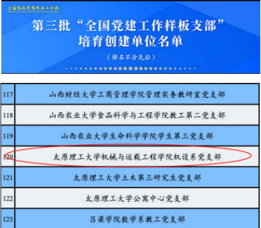 近日,教育部公布第三批新时代高校党建示范创建和质量创优(简称“双创”)培育创建单位名单,新葡官网机设系党支部入选“全国党建工作样板支部”培育创建单位。