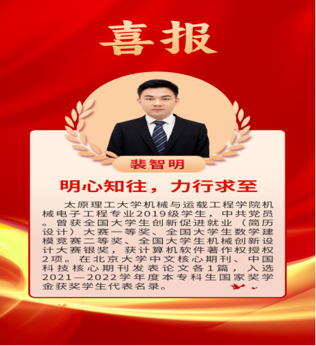 2023年5月4日,《2021—2022学年度本专科生国家奖学金获奖学生代表名录》公布,展示了全国100名国家奖学金获奖学生优秀典型代表。经过严格的推荐、选拔和评审,新葡官网机械电子工程专业2019级本科生裴智明同学,在全国6万名优秀本专科学生脱颖而出,入选全国百名国家奖学金获奖学生代表名录,是我省今年唯一入选的学生代表。