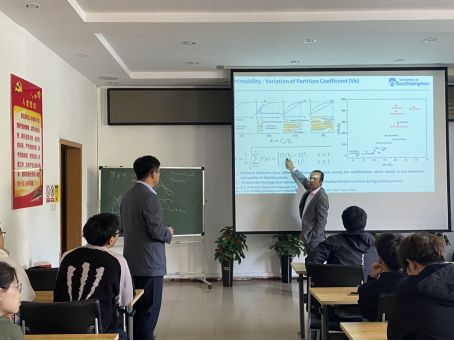 Pedro Rivera做了题为“Design of Additively Manufactured High Entropy Alloys with TRIP effect”的学术报告。他采用PPT结合黑板演示推导的方式,从材料的热力学、微观结构、力学性能、成型性等方面,提出了具有应力诱导塑性的高熵合金设计理念,介绍了高熵合金的相形成规律、3D打印性能、热扩散、热裂纹等设计方案与思路。其详细、条理的阐述给参会师生以启迪和享受,大家纷纷提问和探讨。