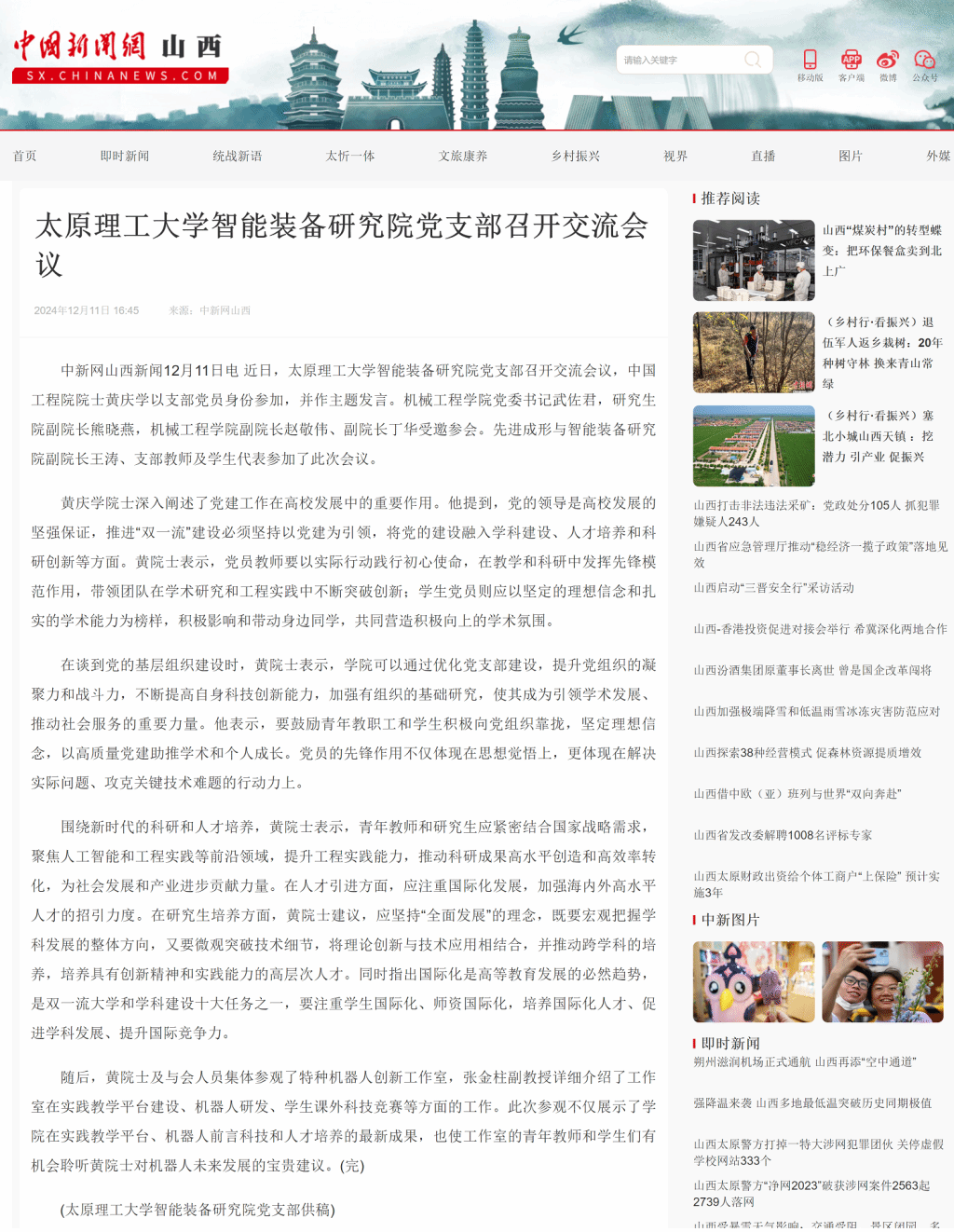 近日,3003新葡官方网站智能装备研究院党支部召开交流会议,中国工程院院士黄庆学以支部党员身份参加,并作主题发言。3003新葡官方网站党委书记武佐君,研究生院副院长熊晓燕,3003新葡官方网站副院长赵敬伟、副院长丁华受邀参会。先进成形与智能装备研究院副院长王涛、支部教师及学生代表参加了此次会议。